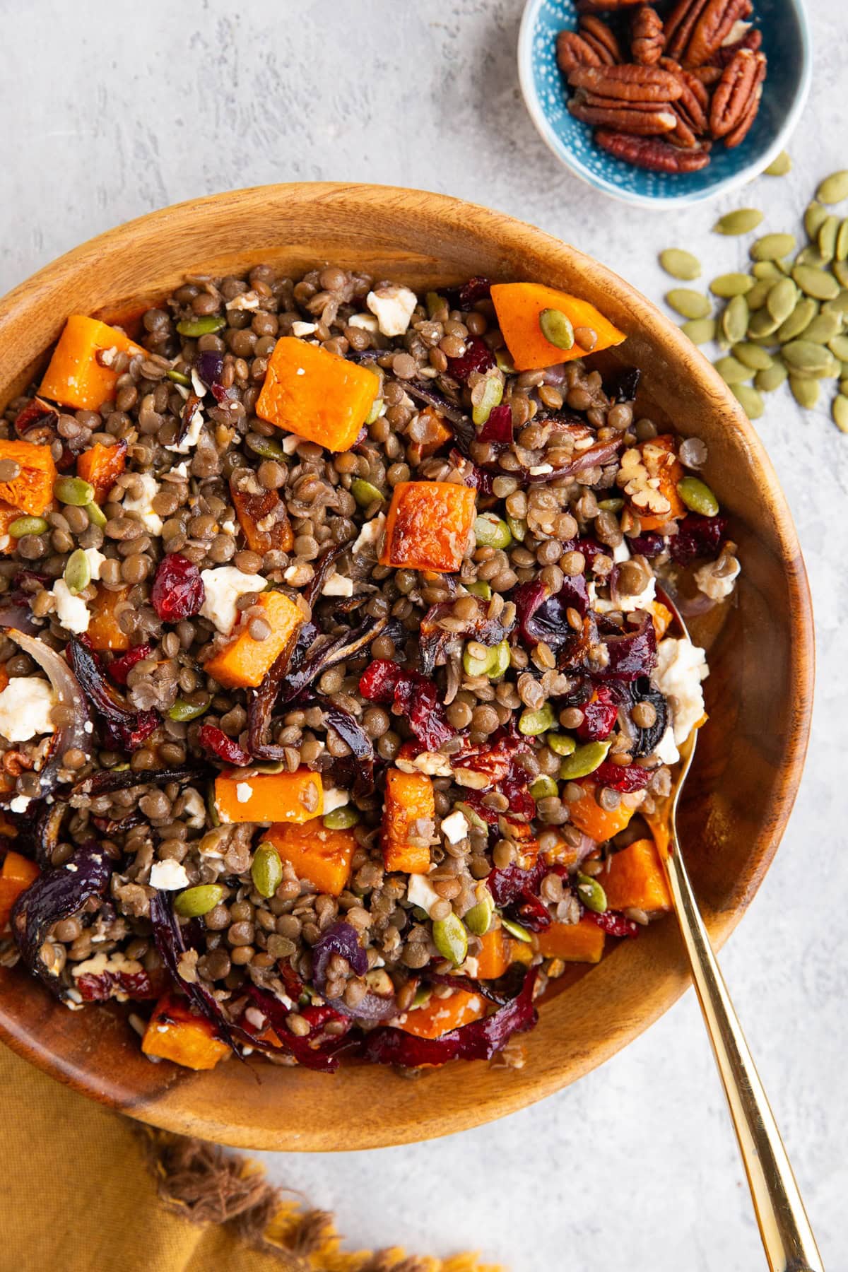 - Once the lentils and the butternut squash are cooked and cooled, transfer them to a large mixing bowl. Add in the feta cheese, pecans, dried cranberries, and pumpkin seeds.