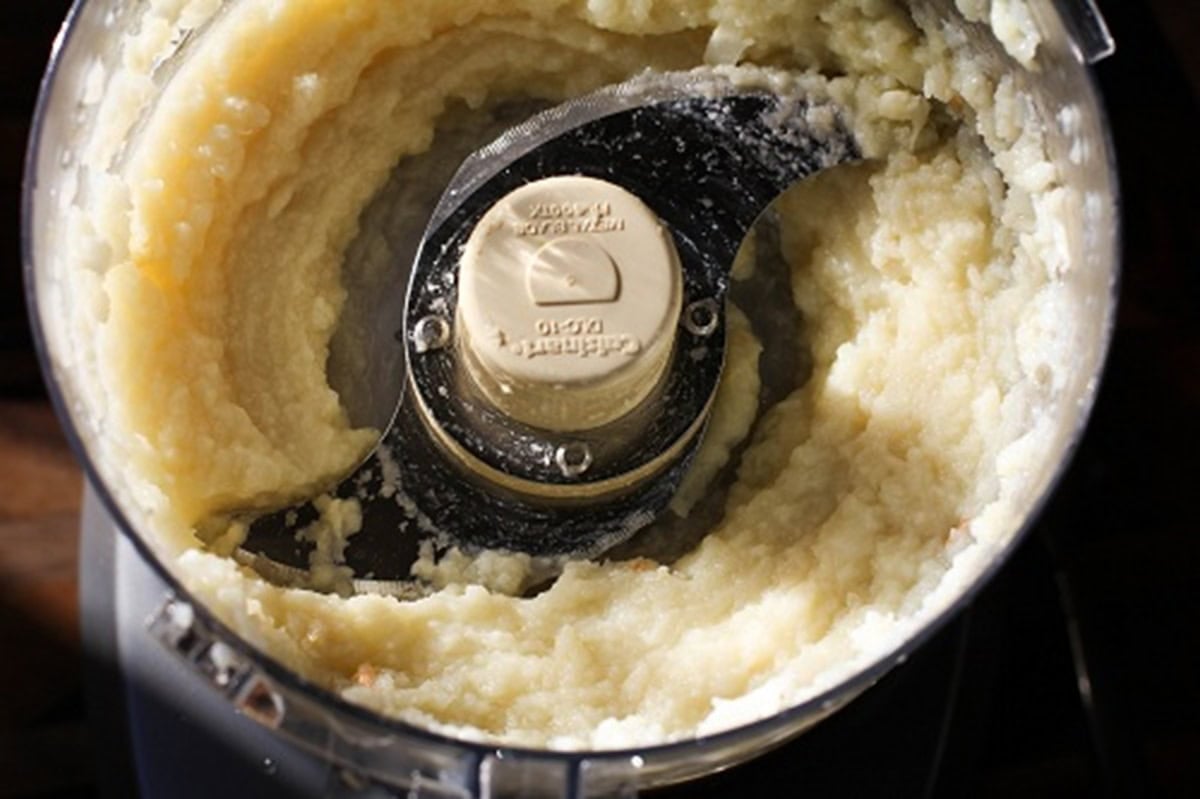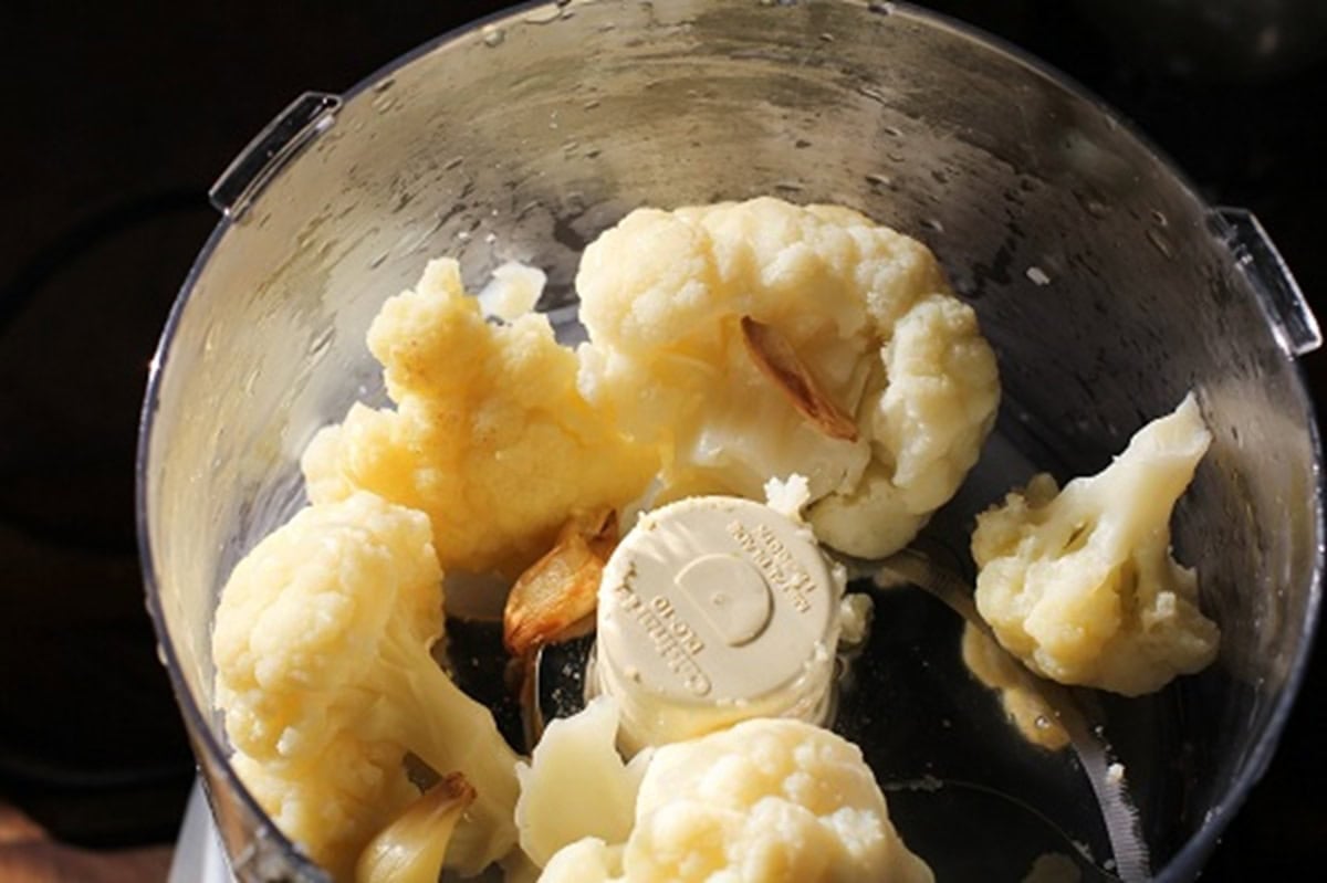 - Unwrap and peel garlic. Blend the cauliflower and garlic in a food processor. This took two batches for me.