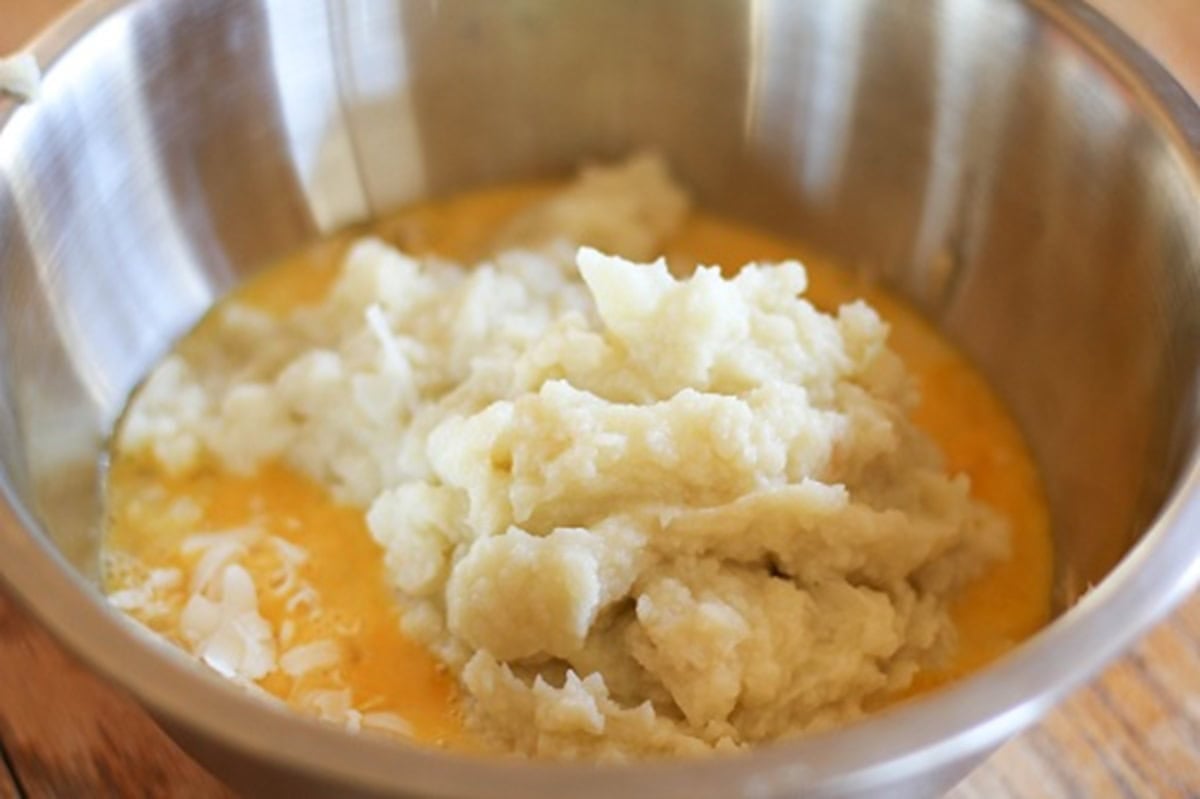 Add the pureed cauliflower/garlic to the bowl with the eggs and cheese.