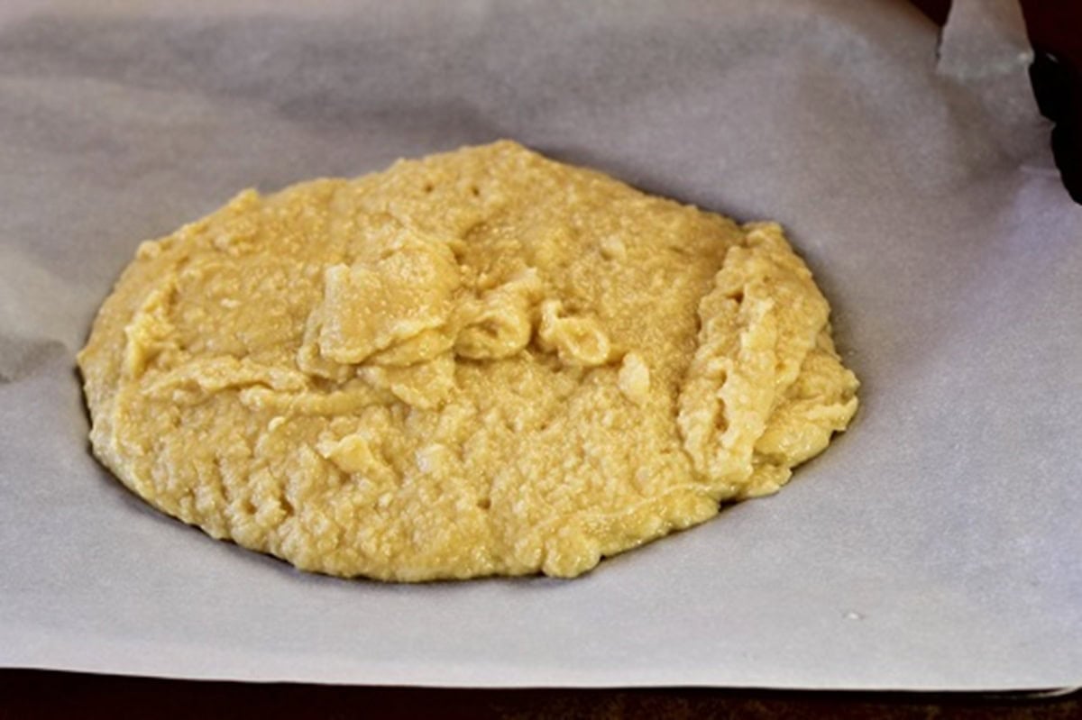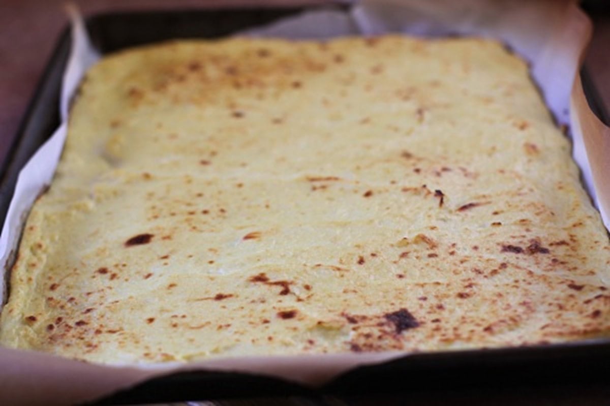Pour the pureed cauliflower mixture on a parchment lined baking sheet.