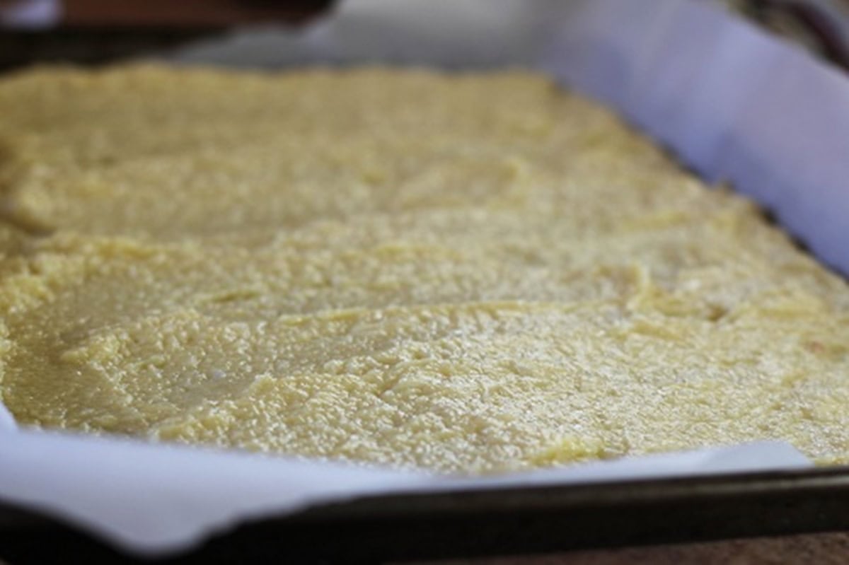 - Pour mixture onto a parchment-lined baking sheet.