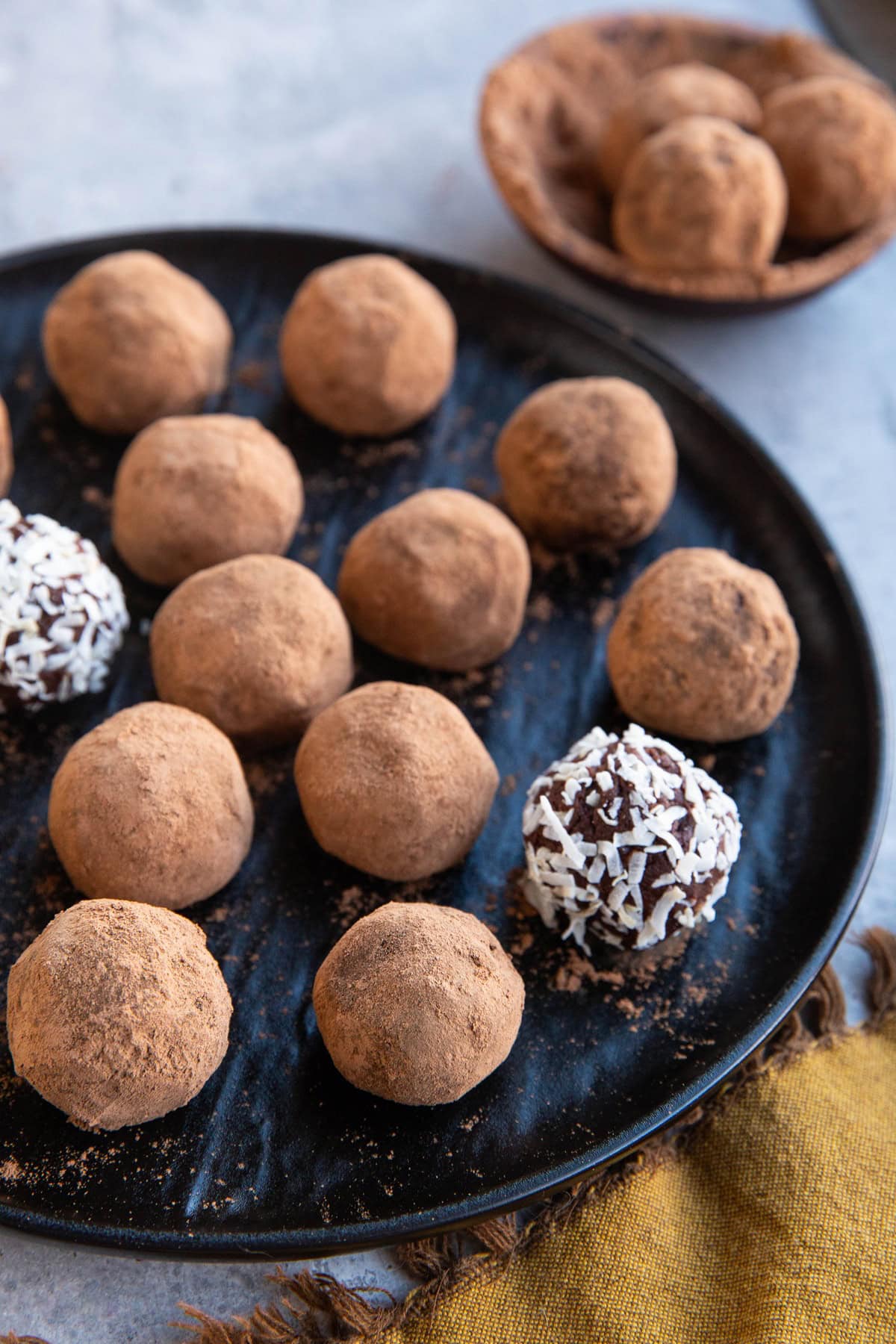 Black plate full of chocolate truffles that are coated with cocoa powder and two are covered with shredded coconut. Ready to serve.