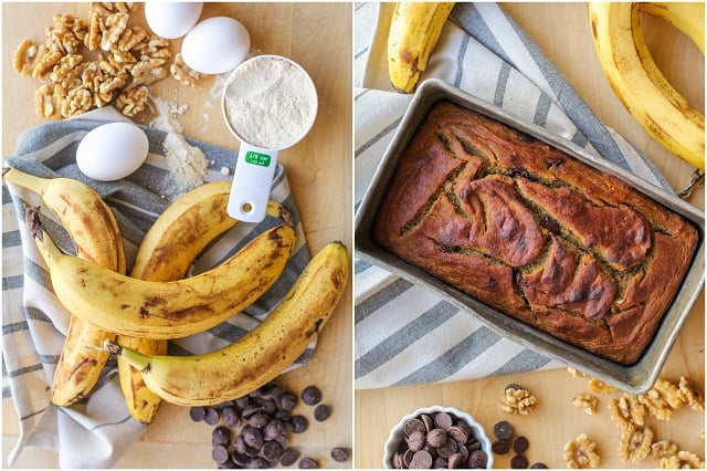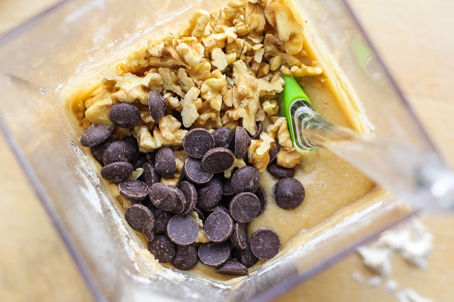 - Add all of the ingredients except for the chocolate chips and walnuts to a blender. Blend until smooth. Fold the chocolate chips and walnuts into the banana bread batter and pour into the prepared loaf pan.