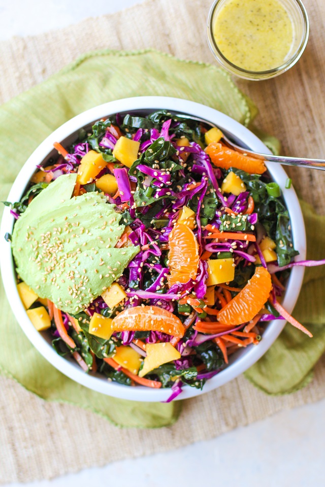 Crunchy Detox Mandarin Kale Salad with avocado, mango, and lemon poppy seed dressing makes for a vibrant superfood meal.