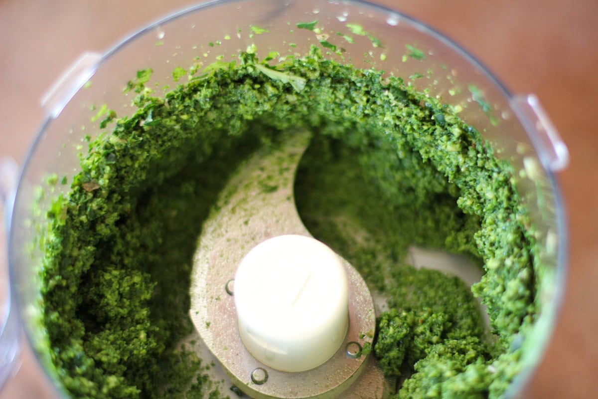 • Once chopped, turn the food processor on and stream the oil through the opening in the top. I like my pesto sauce thick, but you can add more oil to your personal taste.