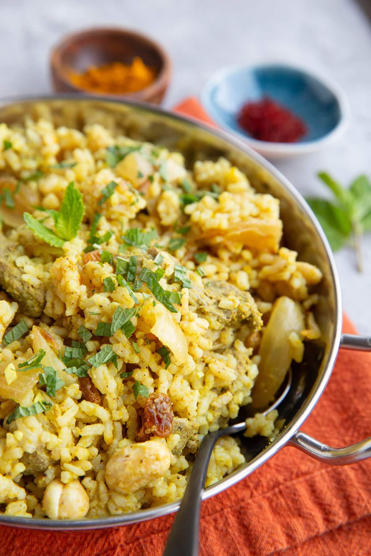 Enjoy this easy homemade Lamb Biryani recipe whenever the craving strikes, and particularly for special occasions! Marinated lamb gets cooked to tender perfection and served surrounding flavorful, aromatic rice, caramelized onion, golden raisins, and cashews or almonds for a magical meal.