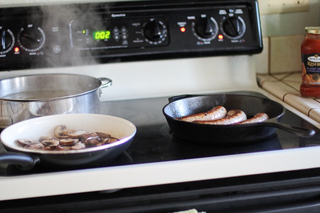 All I did to prepare this recipe was pick up gluten-free pasta, pre-made sauce (I used Bertolli Balsamic Vinegar and Caramelized Onions Sauce, but you can use your favorite store-bought sauce), sausage (I used Carando Italian Sausage, but I also love using chicken sausage!), and mushrooms. Once ingredients are gathered, we perform the following: