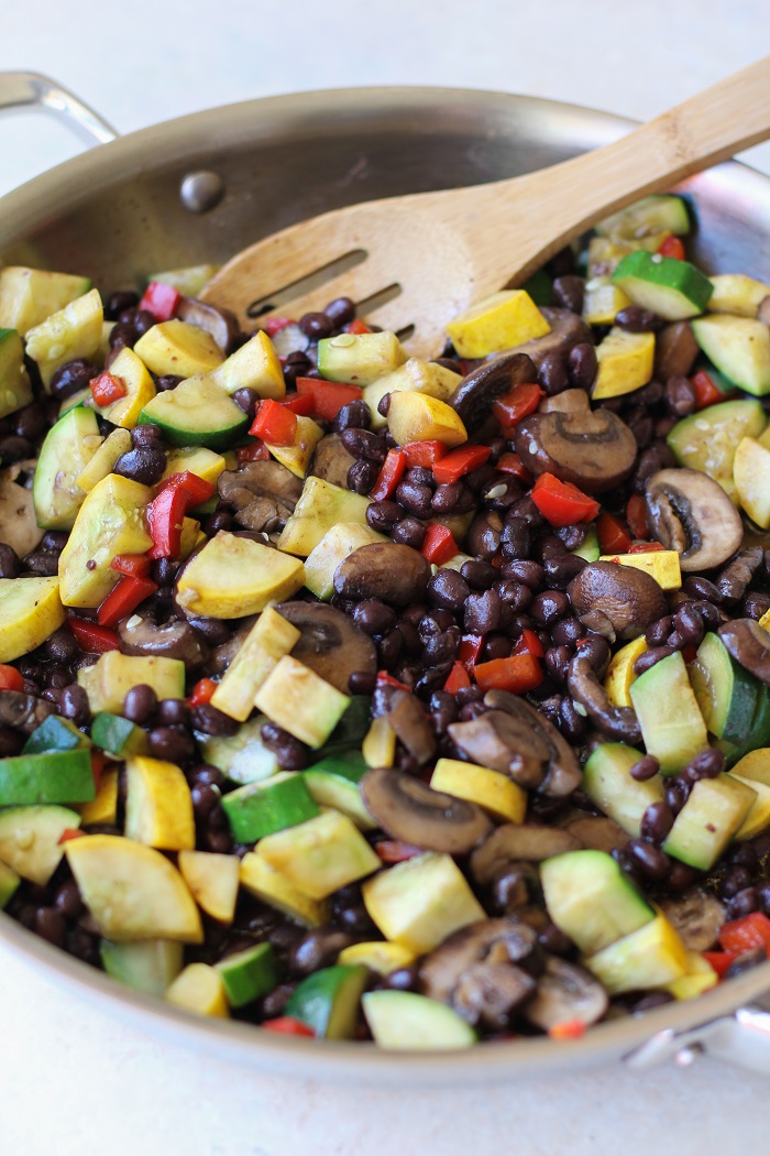 While I’m all about a good pulled pork or chicken enchilada, I can always dig a vegetarian Mexican-inspired meal, especially when packed with hearty fresh ingredients like mushrooms, bell pepper, yellow and zucchini squash, and black beans.