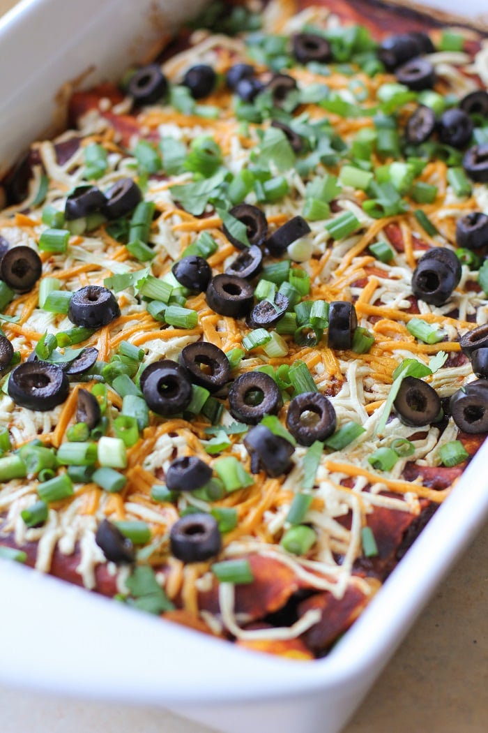 Mmm….there’s nothing like a pan of enchiladas! I love that these are dairy free! And all the healthy veggies inside? Just perfect.