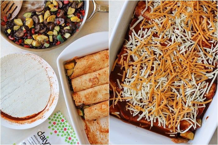 Simply sauté the veggies, then give each tortilla a quick soak in some enchilada sauce – this ensures the tortillas get nice and soft while baking in the oven for optimal goo factor.