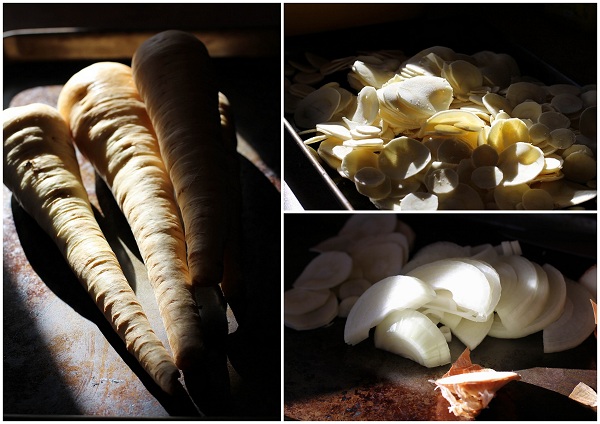 - 2 1/2 pounds parsnips, peeled and very thinly sliced (1/8” thin or thinner)