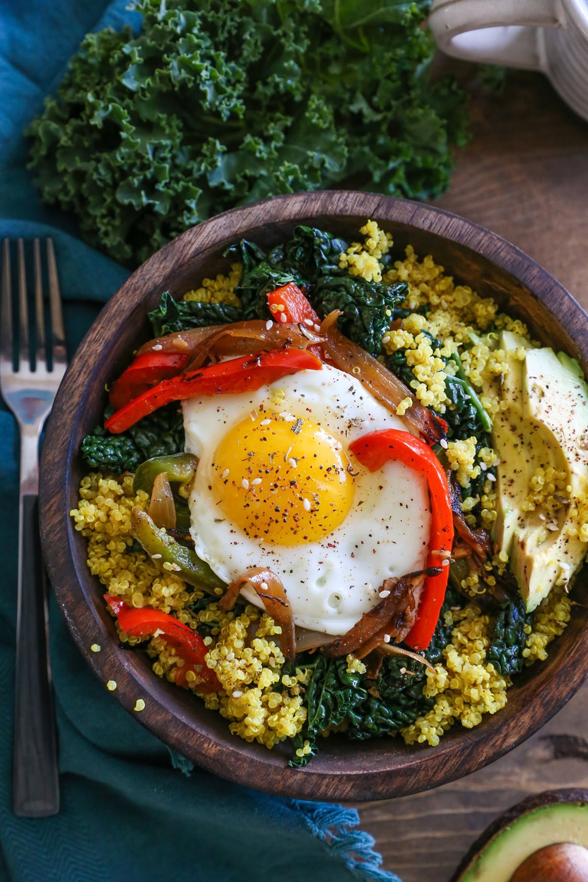 The flavors are layered and cozy: nutty quinoa steamed with turmeric, ginger, and lemon zest, topped with tender sautรฉed peppers and kale, creamy avocado, and a perfectly runny egg.