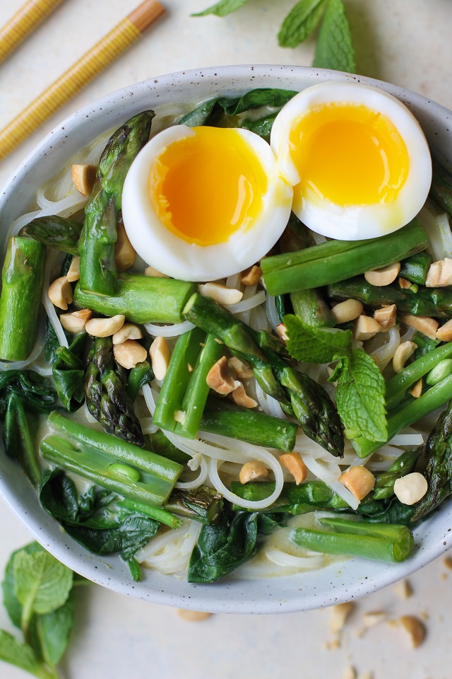 Spring Vegetable Green Curry Noodle Bowls with asparagus, green beans, coconut milk broth, rice noodles, and a runny egg. A delicious, comforting yet fresh and healthy vegetarian meal.